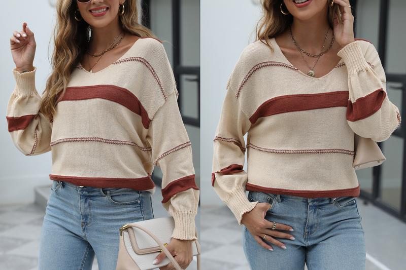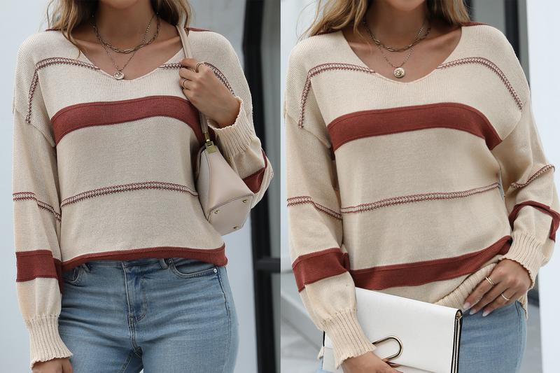 【Features】: V neck knit pullover. Classic contrast striped design style integrates fashion elements to show a simple and atmospheric style, long sleeve, drop shoulder, ribbed cuffs and hem, stitching details, loose fit, making it versatile for both casual and more dressed-up occasions