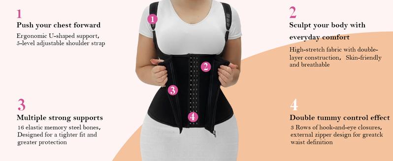 - DISTINCTIVE AND ERGONOMIC DRESS STYLE: Featuring a 3-row hook-and-eye closure design on the inner side, adjustable to your preferences. The outer zipper closure design provides double pressure,6 adjustable straps for more comfort, effectively tightening waist and abdominal fat to minimize unsightly bulges, giving your body a more natural and slim appearance.